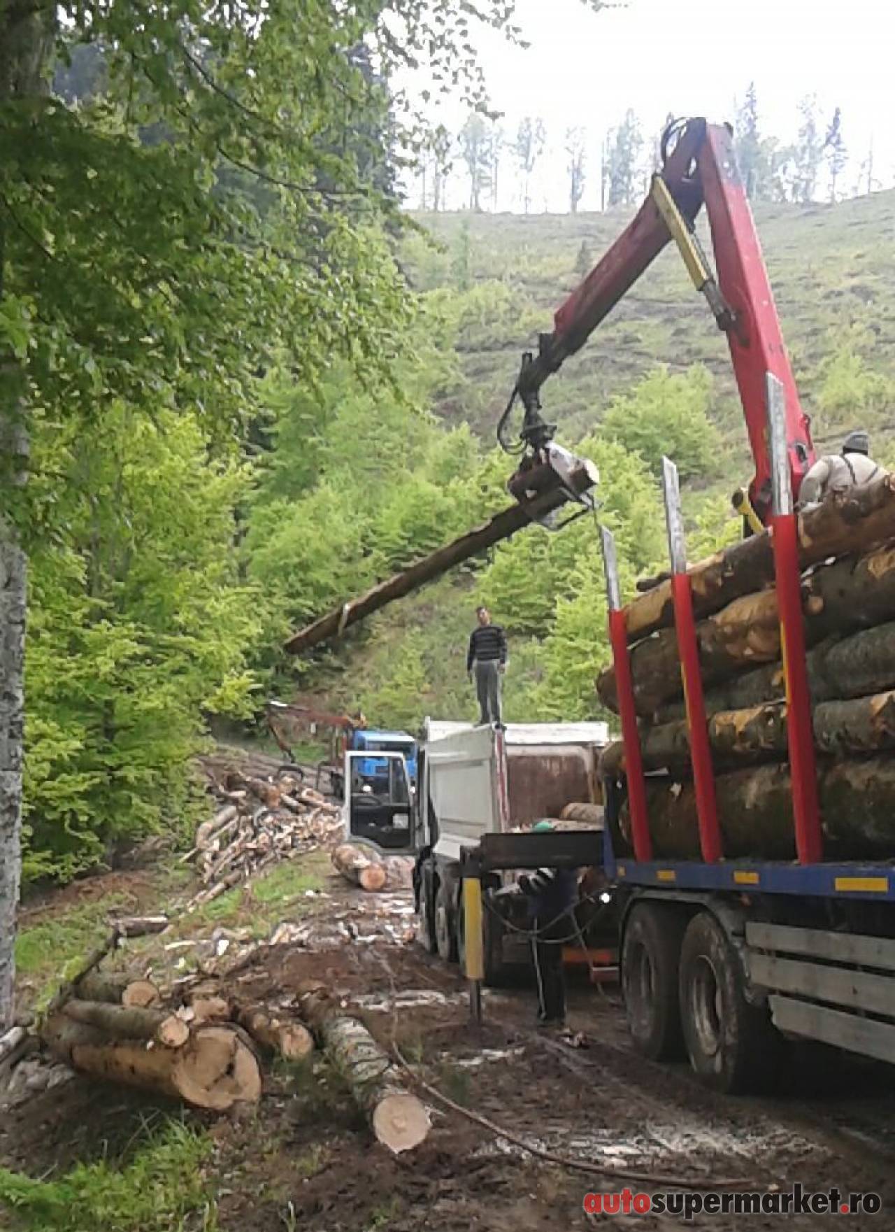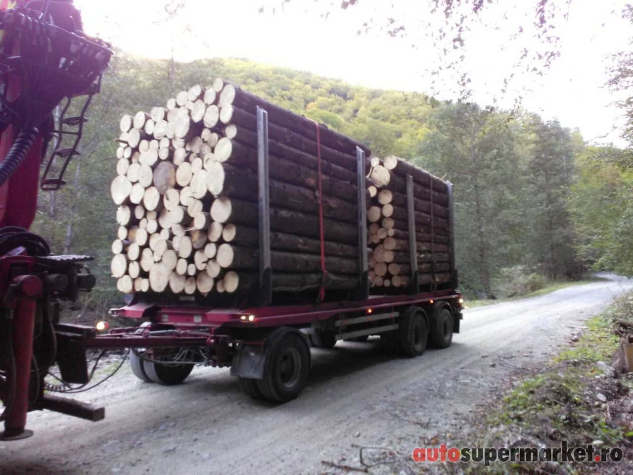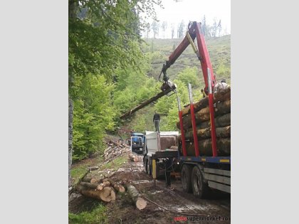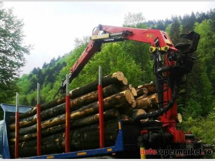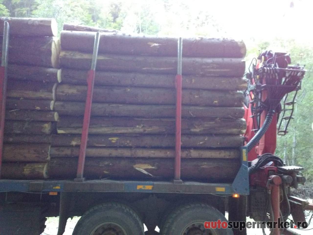 Ansamblu transport forestier cu macara Âşi remorcĂŁ 26 tone + 18 tone (total 44 tone).