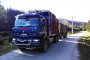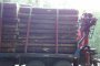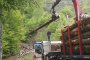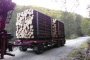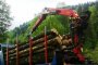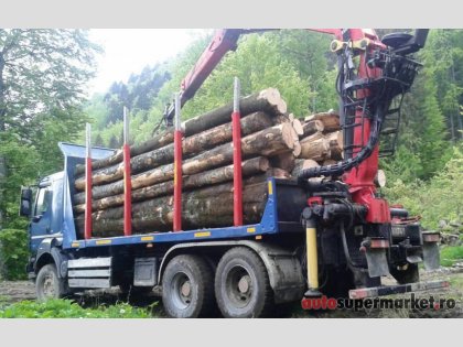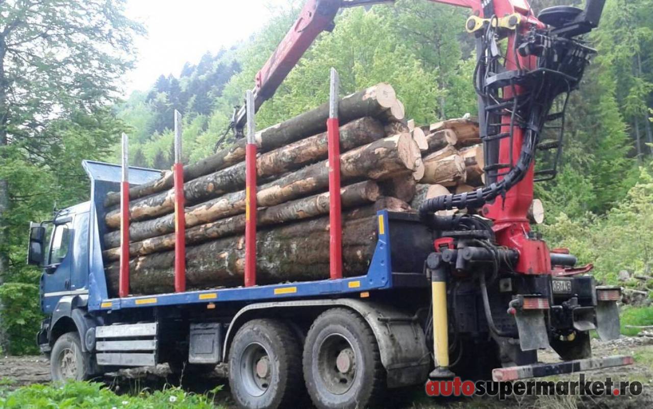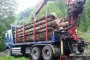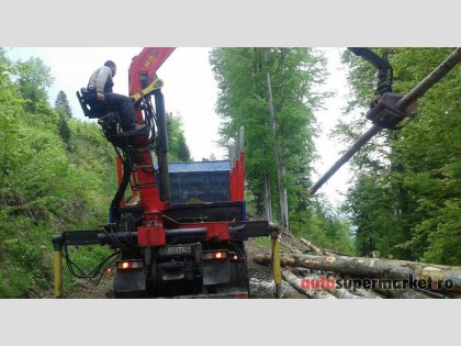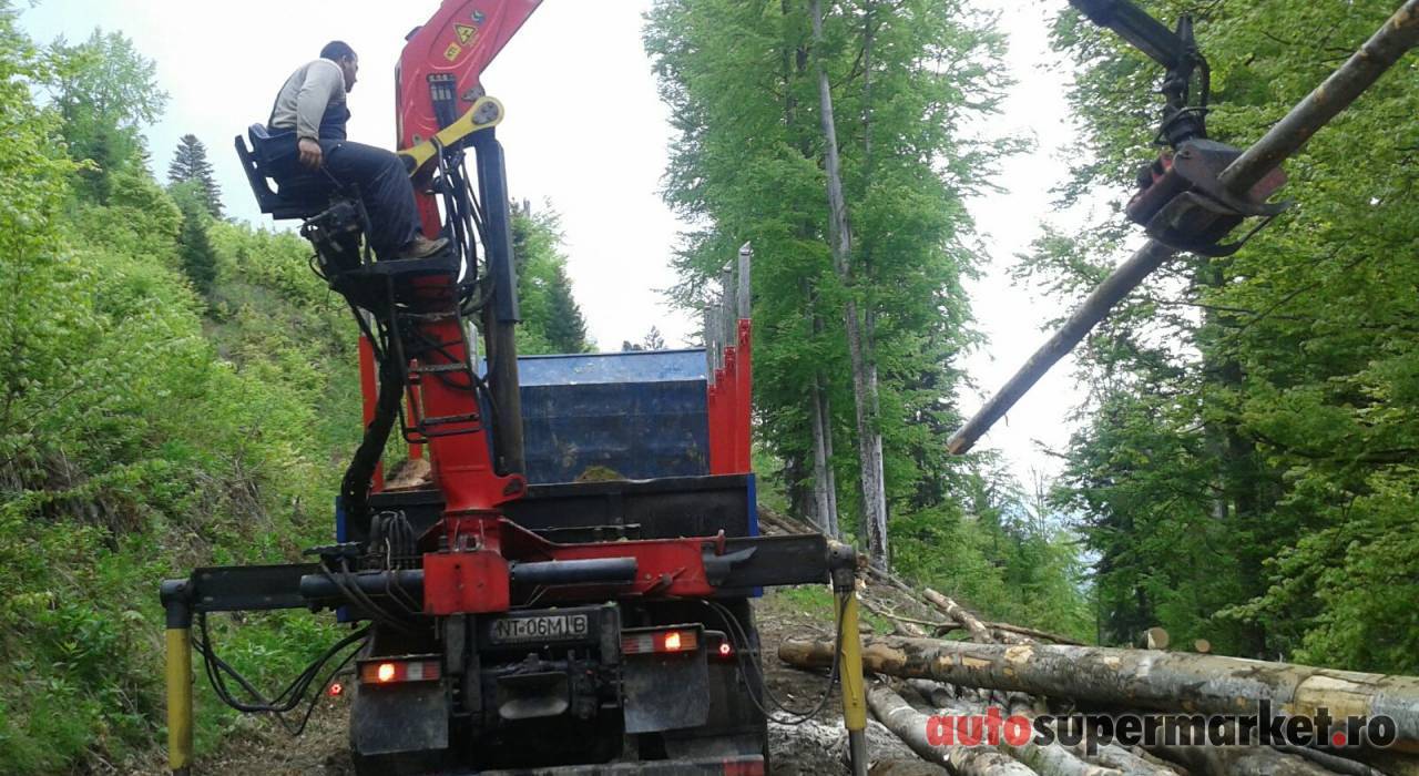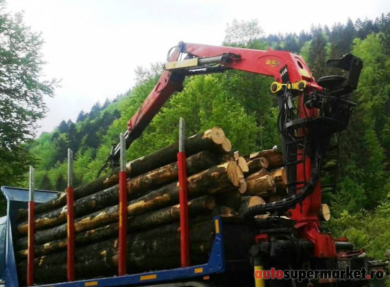 Ansamblu transport forestier cu macara Âşi remorcĂŁ 26 tone + 18 tone (total 44 tone).