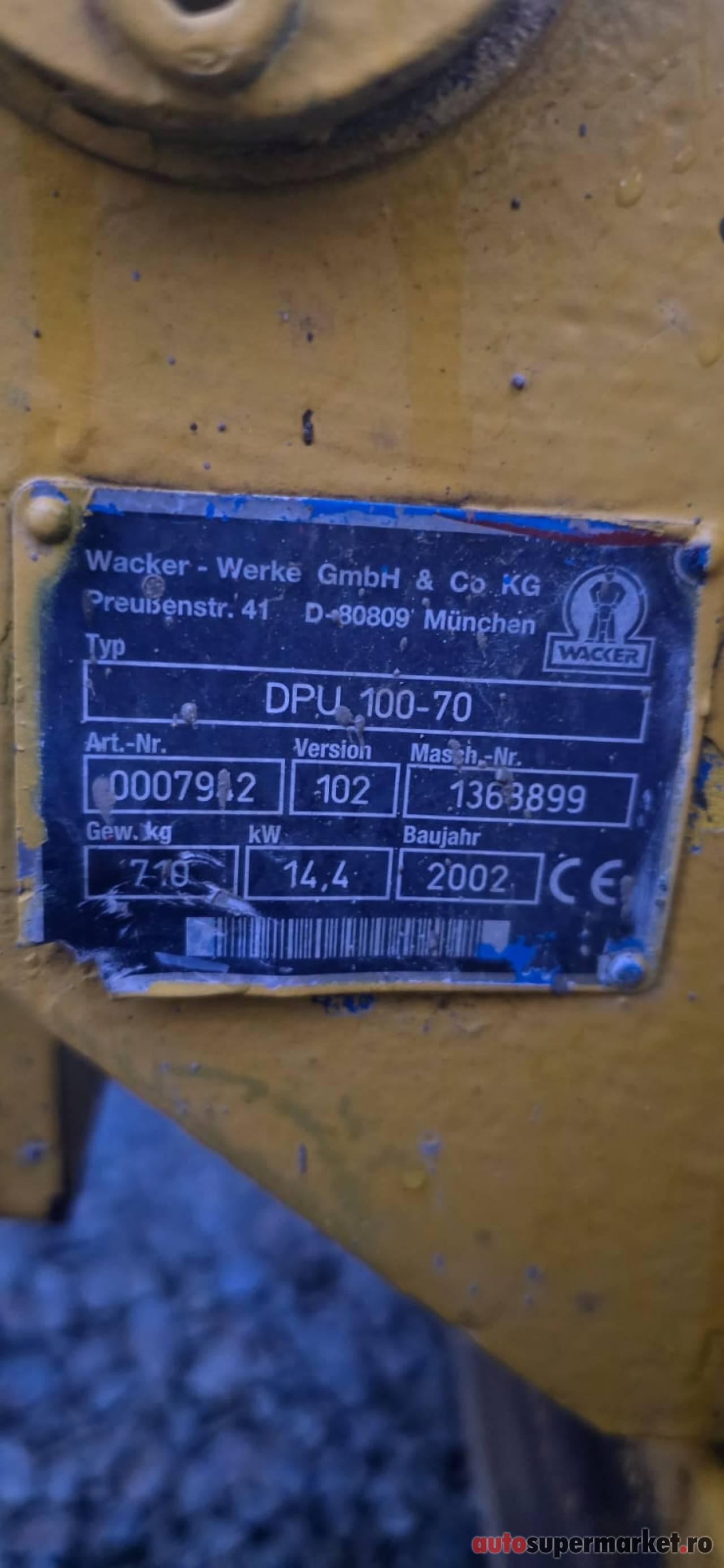 Placa compactoare Wacker model DPU 100-70, greutate 710 kg, putere 14.4 KW (20 CP), an 2002, motor diesel in 2 pistoane, stare buna de functionare.