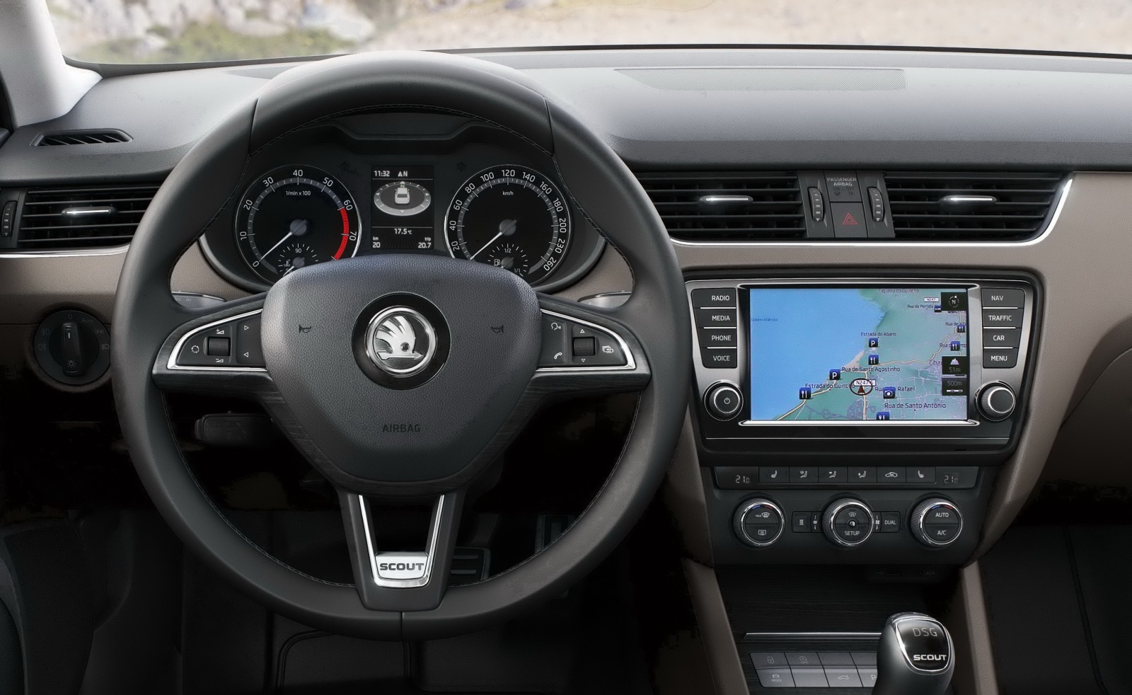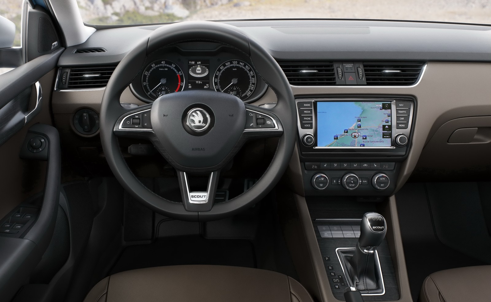 Interiorul este echipat cu inserturi de culoare închisă, piele fină și volan personalizat cu prenumele versiunii. Titulatura Scout apare nu doar pe volan ci și pe schimbătorul de viteze.